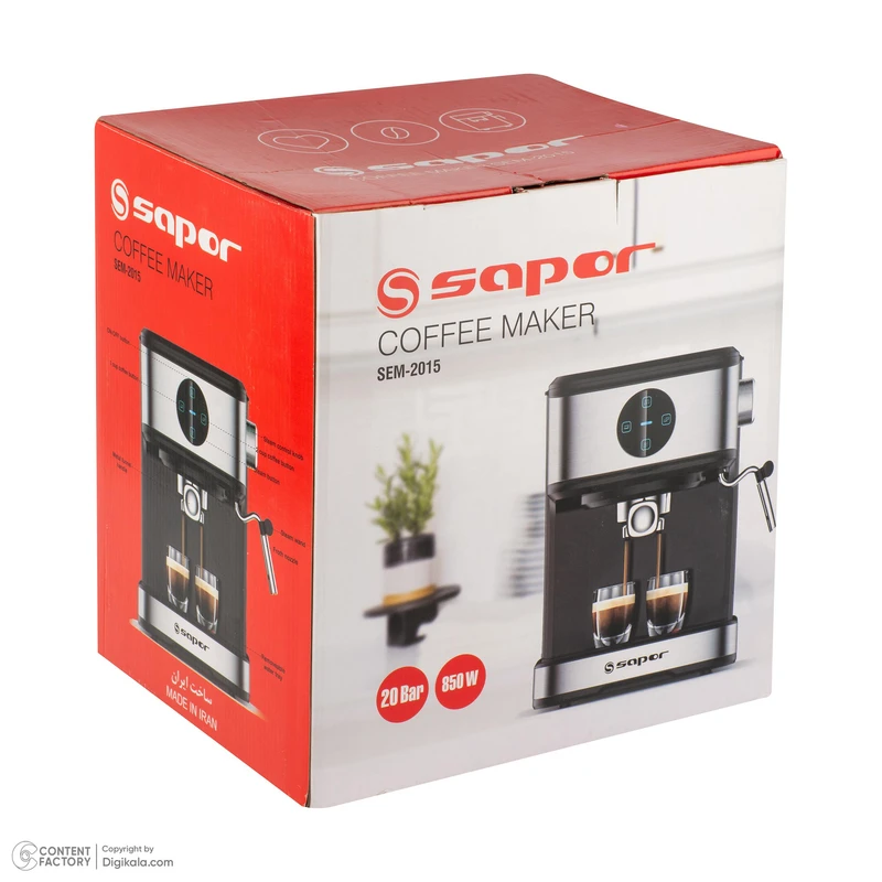 اسپرسوساز ساپر با توان ۸۵۰ وات و فشار بخار ۲۰ بار، قادر است در مدتزمان کوتاهی عصارهای غلیظ و معطر از قهوه استخراج کند. سیستم دمآوری با فشار بخار، طعمی طبیعی ایجاد میکند که پایهای ایدهآل برای تهیه انواع نوشیدنیهای قهوه است.این مدل از پودر قهوه استفاده میکند و به نازل بخار دستی مجهز است که کنترل کاربر در فومدهی شیر را افزایش میدهد. با کمک این نازل میتوان نوشیدنیهایی مانند کاپوچینو، کافهلاته و حتی آبجوش برای دمنوش یا آمریکانو را تهیه کرد. صفحهنمایش دیجیتالی دستگاه وضعیت عملکرد و انتخاب منوهای نوشیدنی را بهصورت واضح نشان میدهد. سینی چکهگیر در بخش زیرین، با طراحی جداشونده، نظافت روزانه را ساده کرده و مانع از تجمع قطرات آب میشود. سیستمهای ایمنی خاموشی خودکار و حفاظت در برابر گرمای بیش از حد نیز عملکردی مطمئن و ایمن تضمین میکنند.در مجموع، اسپرسوساز ساپر مدل SEM‑2015 با توان ۸۵۰ وات، فشار بخار ۲۰ بار، بدنه استیل و منوی متنوع نوشیدنی، انتخابی ایدهآل برای مصارف خانگی است که کیفیت، ایمنی و طراحی مدرن را در کنار هم ارائه میدهد.